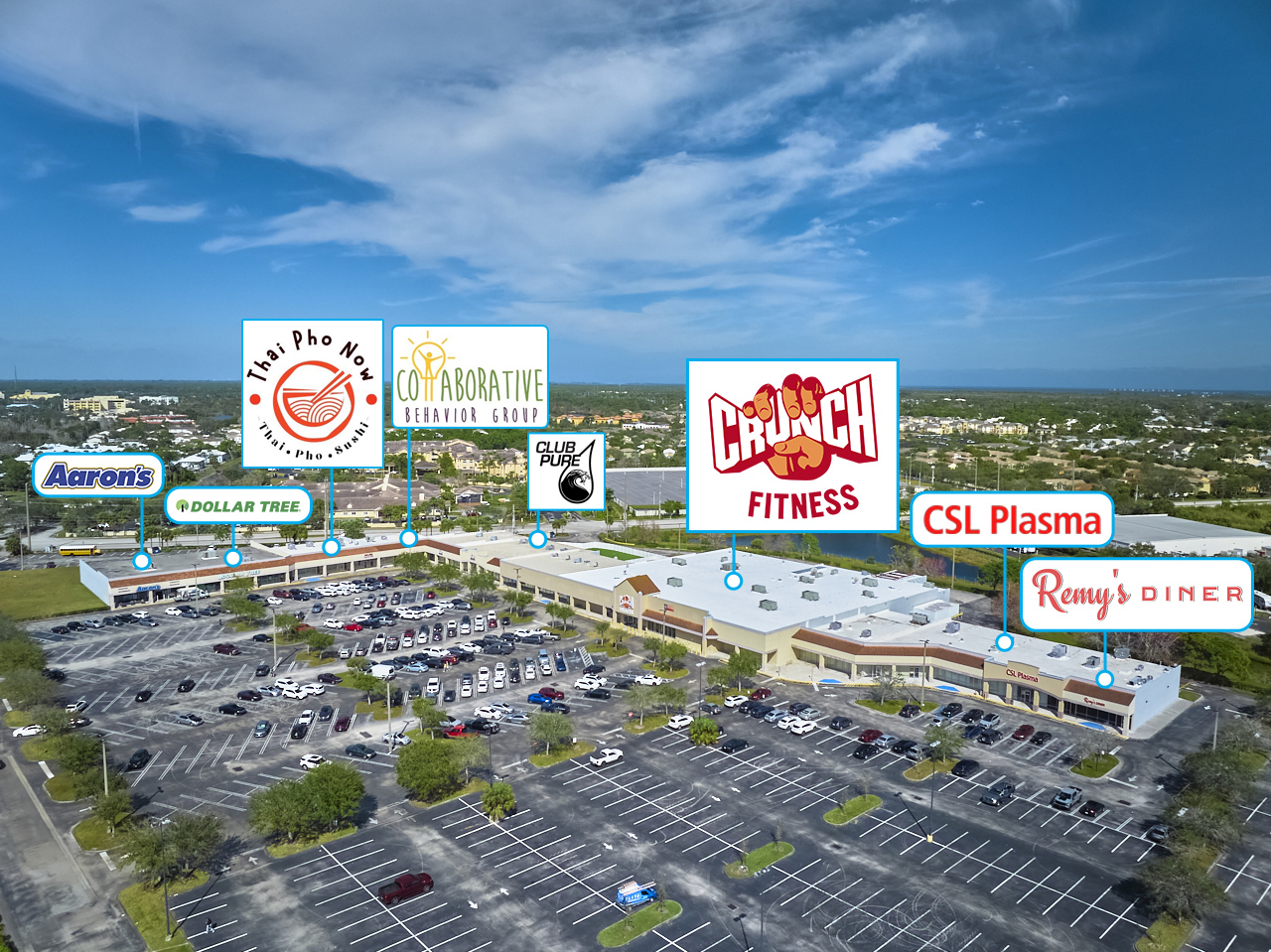 The plaza is currently home to a range of tenants, including Aaron’s, Dollar Tree, and Club Pure preschool, as well as the newly opened Crunch Fitness. These established businesses ensure a steady stream of foot traffic and contribute to the plaza’s stability. Additionally, Remy’s Diner, a highly anticipated eatery offering classic comfort food in a welcoming atmosphere, will be opening soon. Along with Collaborative Behavior Group’s expansion by 2,400 sq. ft., these additions further enhance the plaza’s attractiveness and reinforce its position as a premier destination for retail and services in Port St. Lucie.