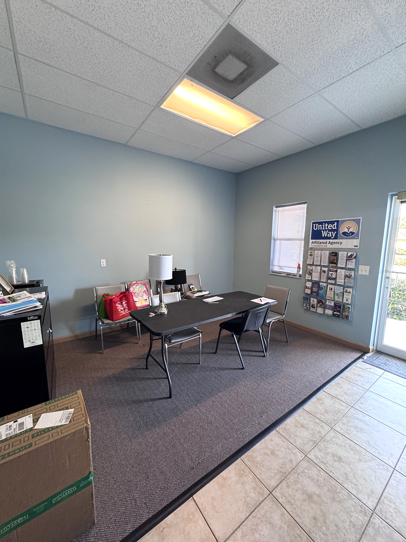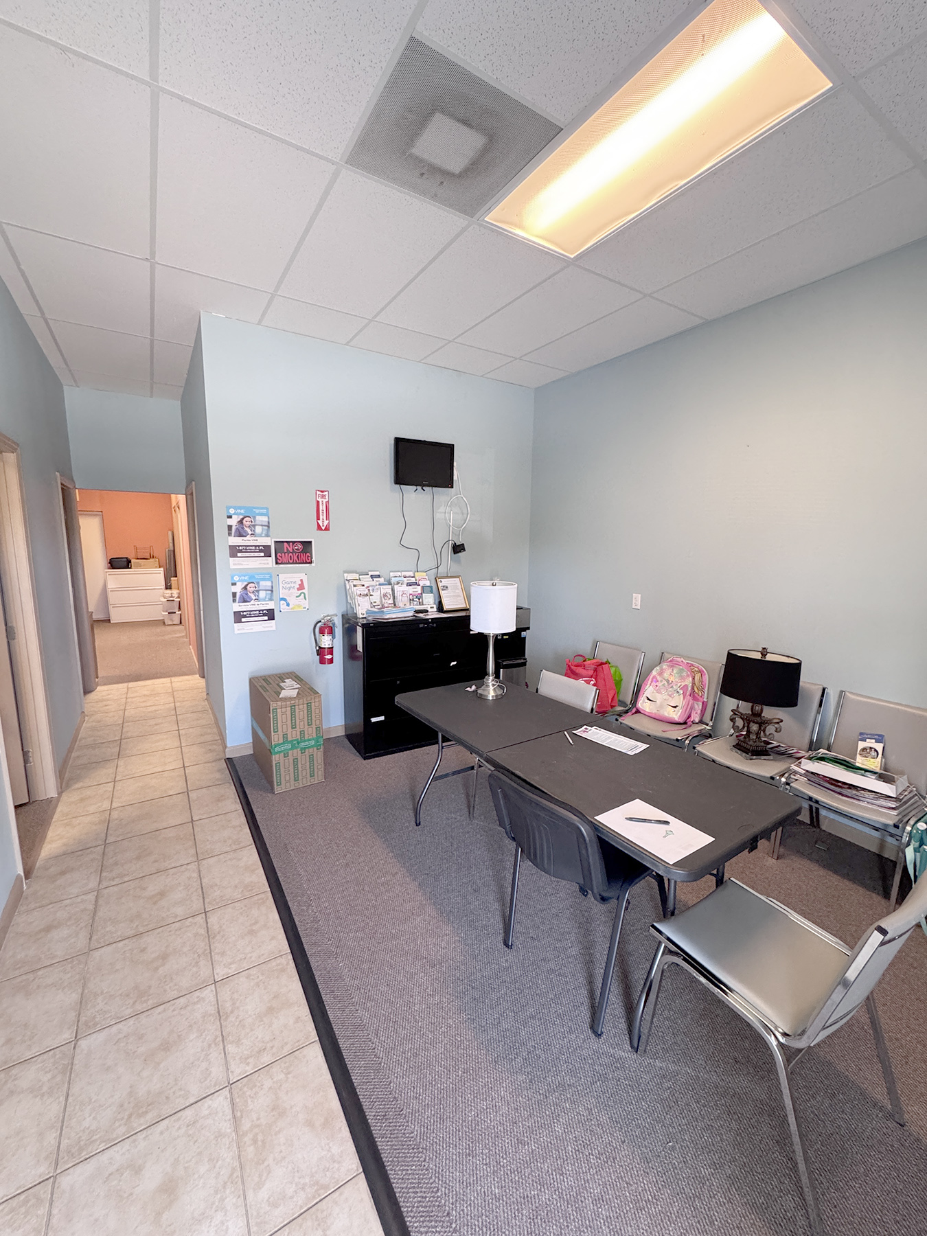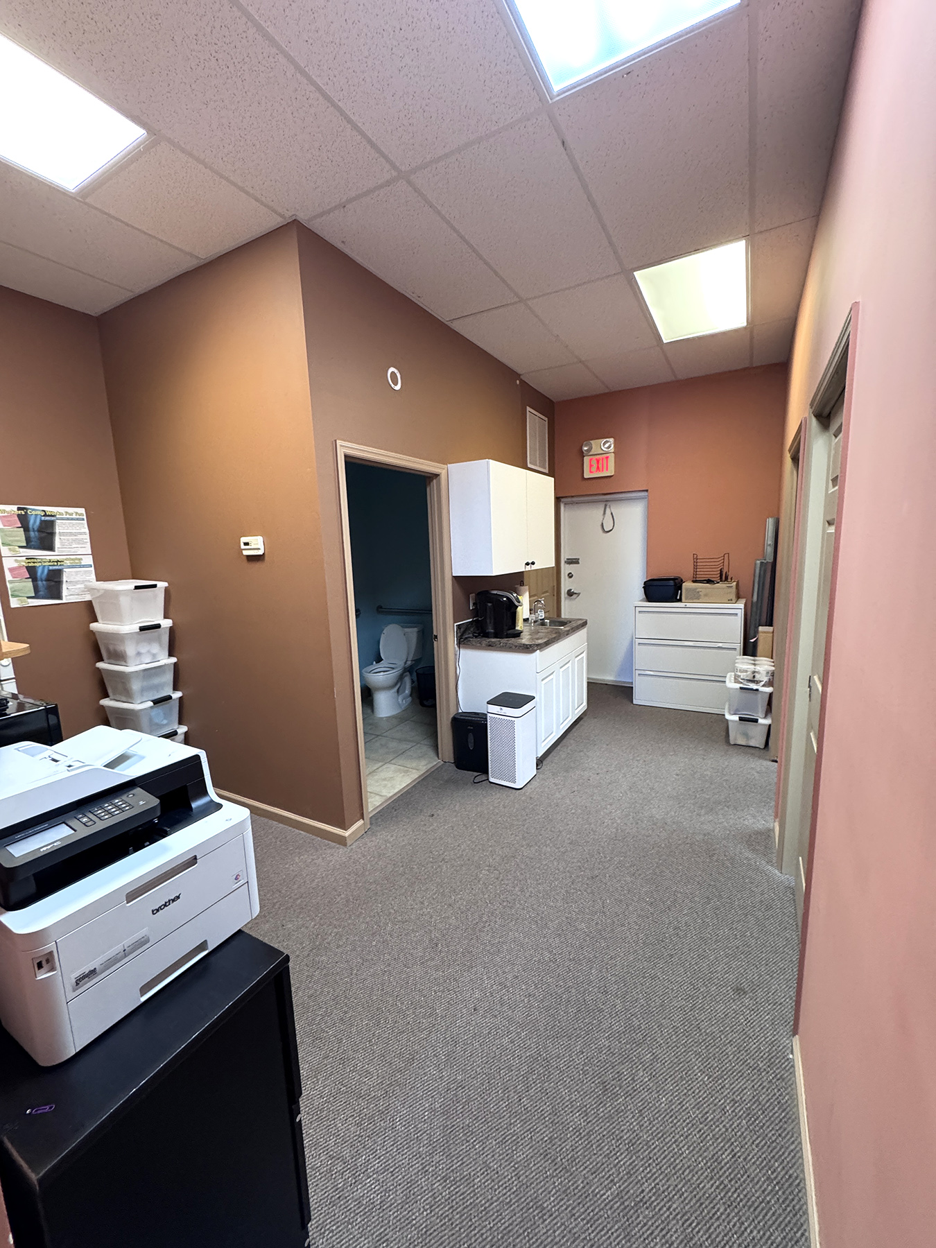 The layout includes five private offices, reception area, and break area, ideal for professional users such as non-profits, administrative offices, counseling, and insurance services.